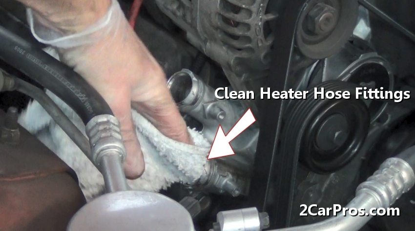Step 9 - Once the heater hoses have been removed, use a shop towel to clean the heater hose fittings to help seal the new hose installation.