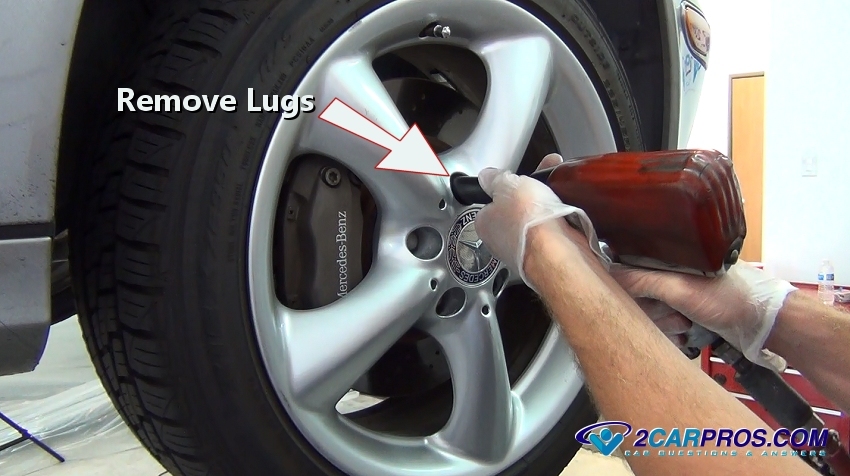 Step 1 - Once the vehicle is safely lifted, remove the lug nuts, if a manual wrench is used break the lugs loose while the vehicle is still on the ground, it will hold the tire from turning.