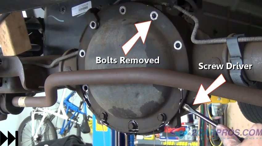 Step 2 - Once all other bolts have been removed use a screw driver to help separate the cover from the differential housing. Once the seal has been broken gear oil will start to flow out. (Note: position a oil drain catch basin under the differential cover.)