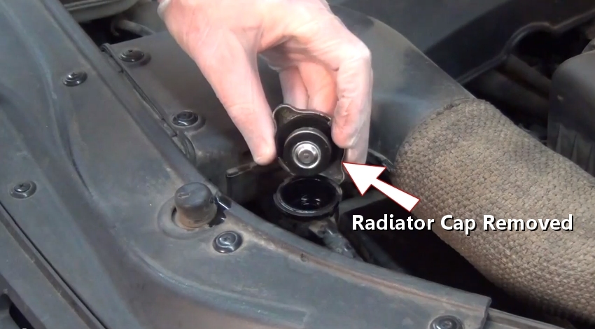 Step 2 - Once the cap has been turned counter clockwise while pushing downward, lift the cap from the radiator.