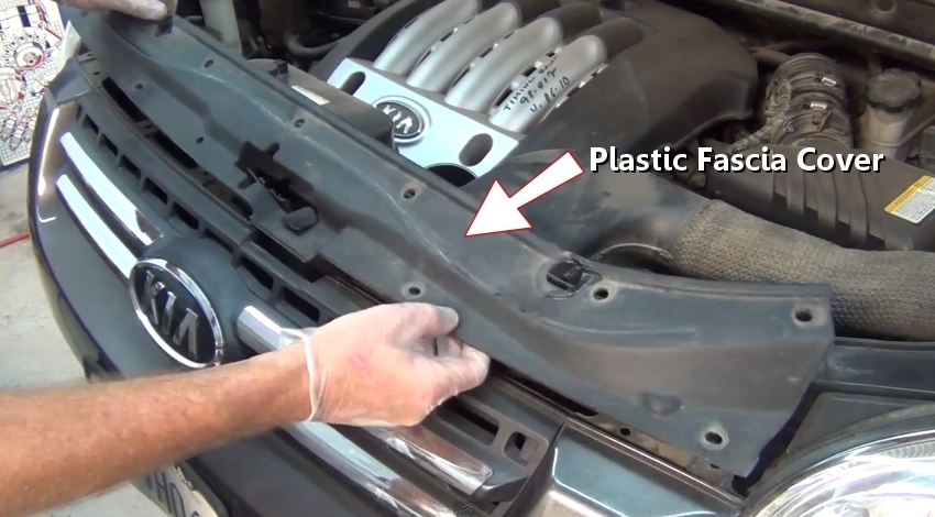 Step 6 - After the coolant has finished draining, remove the mounting bolts or clips holding the air intake and the plastic fascia over the radiator.